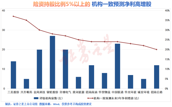 截至今年三季度末,险资已经合计持有700只A股股票。对其中32只个股的持股数占总股本比例超5%,达到“举牌线”。这32只个股中,还有12只获5家机构以上评级且一致预测2024~2026年净利润复合增速超20%,银轮股份、三美股份、兴齐眼药、招商南油、中国联通、招商公路等均在其中。