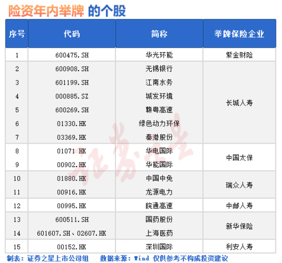 具体来看,A股方面今年以来已有华光环能、无锡银行、江南水务、城发环境、赣粤高速、国药股份、上海医药等公司获得险资举牌;港股方面也有绿色动力环保、秦港股份、华电国际、华能国际、中国中免、龙源电力、皖通高速等获得险资关注。