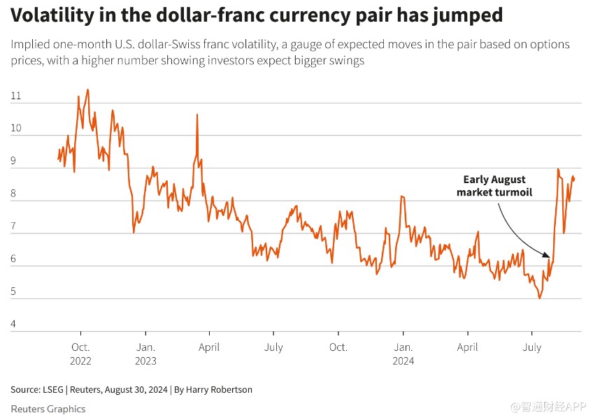 随着日元贬值,瑞郎的吸引力进一步增强。8月份,受美国经济数据疲软和日本央行意外加息的影响,日元大幅上涨,日元套利交易因此崩盘,引发全球市场动荡。