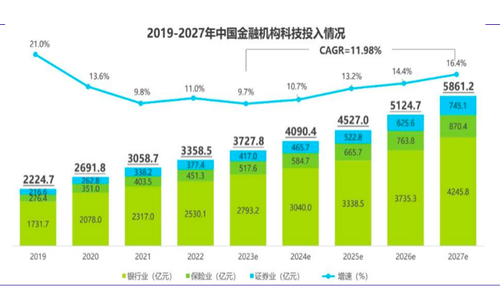 依据艾瑞咨询和前瞻研究院提供的数据,截至2023年末,持牌金融机构累计金融科技投入规模达到3727.8亿元,预计这一规模至2027年时将达到5861.2亿元。